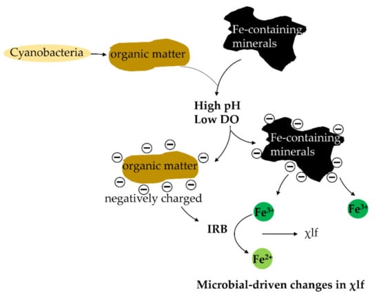 χlf was correlated with community composition of many phyla, including Alphaproteobacteia, Betaproteobacteia, Planctomycetes, and Cyanobacteria. Cyanobacteria showed a positive correlation with χlf, suggesting that χlf might be related to the growth patterns of ecologically important species such as Cyanobacteria, one of the main participants of primary productivity in the global carbon cycle. In sediment, available iron is momentous for Cyanobacteria growth, and Fe oxide minerals have the largest release potential []. Therefore, the growth of Cyanobacteria is heavily influenced by Fe availability in all water bodies []. The organic matter production and the carbon cycle are also affected by Fe availability. The χlf values are coupled to iron-reducing bacterial activity in hydrocarbon contaminated sediments []. In our study, we found that iron-reducing bacteria were more abundant in sites with higher χlf values (Figure 2). A negative relationship between TOC and χlf was observed in the RDA assay, indicating that consumed TOC might be used for iron-reducing bacteria growth, because numerous bacteria including iron-reducing bacteria are dependent on organic matter produced by Cyanobacteria. In the Bohai Sea organic matter could associate microbial iron related metabolism with microbial-driven changes in magnetic susceptibility [] as shown by measurable χlf values (Figure 6).