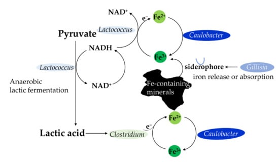 - Weber, K.A.; Achenbach, L.A.; Coates, J.D. Microorganisms pumping iron: Anaerobic microbial iron oxidation and reduction. Nat. Rev. Microbiol. 2006, 4, 752–764. [Google Scholar] [CrossRef] [PubMed] [Green Version]