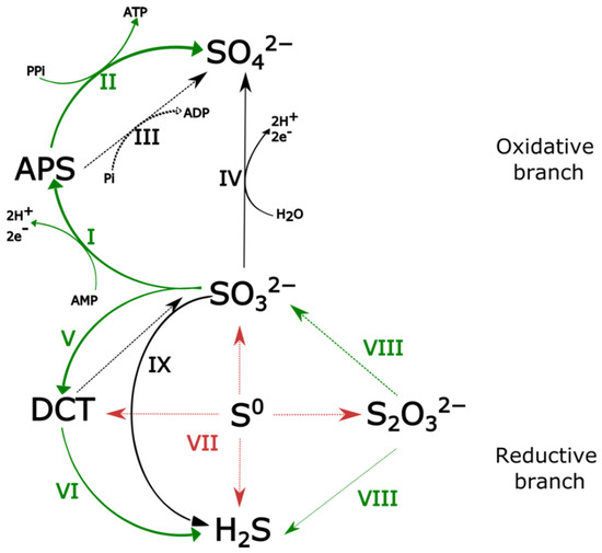 - Krämer, M.; Cypionka, H. Sulfate formation via ATP sulfurylase in thiosulfate- and sulfite-disproportionating bacteria. Arch. Microbiology 1989, 151, 232–237. [Google Scholar] [CrossRef]