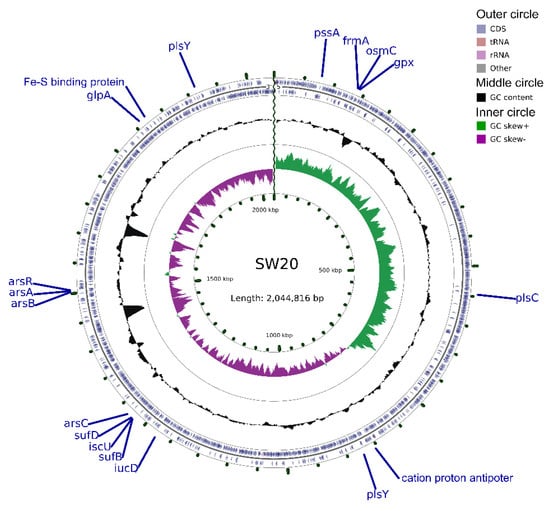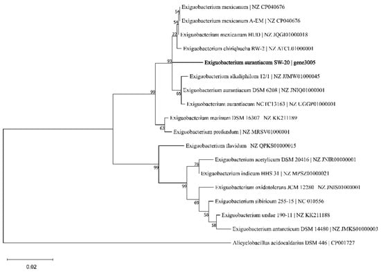 The 16S rRNA gene sequence of E. aurantiacum SW-20 was found to be highly similar to the closest type strain E. mexicanum A-EM, which was isolated from seafloor hydrothermal vents (Caifan field, 14.0S 14.4 W) [] and shared phylogenetic similarity with the other members of Exiguobacterium genus (Figure 1). The genomic length of E. aurantiacum SW-20 is 2,953,062 bp, with an average GC% content of 52.19%. The largest liner contig size is 2,044,816 bp, as shown in Figure 2, and the visualization is limited to the largest linear contig of the genome because these key genes that we care about can be found in this sphere. A total of 2979 CDS were predicted in the genome using Prokka v.1.