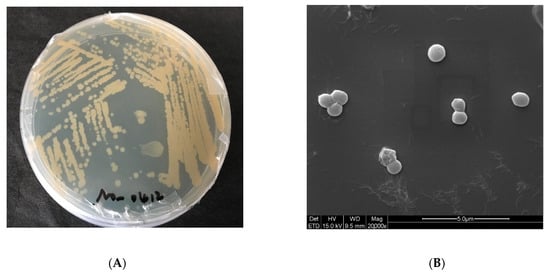 Exiguobacterium aurantiacum (E. aurantiacum) is a genus of bacilli and a member of the low GC phyla of Firmicutes. Collins et al. first described the genus Exiguobacterium with the characterization of E. aurantiacum strain DSM6208T from an alkaline potato processing plant []. Exiguobacterium with a high tolerance of NaCl (12% NaCl) and could live in a wide range of temperature [,], indicated that different kinds of Exiguobacterium could be isolated from different temperatures. Because of their ability to survive in a variety of temperature extremes, they are an important area of study. Some strains, in addition to dynamic thermal adaptation, are also halotolerant (13% NaCl was added to the medium), can grow within a wide range of pH values (5–11), and tolerate high levels of UV radiation and heavy metal stress (including arsenic) []. Previous studies have shown that most members from Exiguobacterium genus isolated to date are Gram-positive and generally rod-shaped [,,]. When in logarithmic or stable growth phases, the majority of them are facultative anaerobic, and some are spherical []. Colonies formed in the nutritional medium under aerobic conditions are mostly round and light yellow or even orange, whereas colonies formed under anaerobic conditions are milky white; to a certain extent, the change of pigment content can also reflect the growth characteristics of bacteria [,].