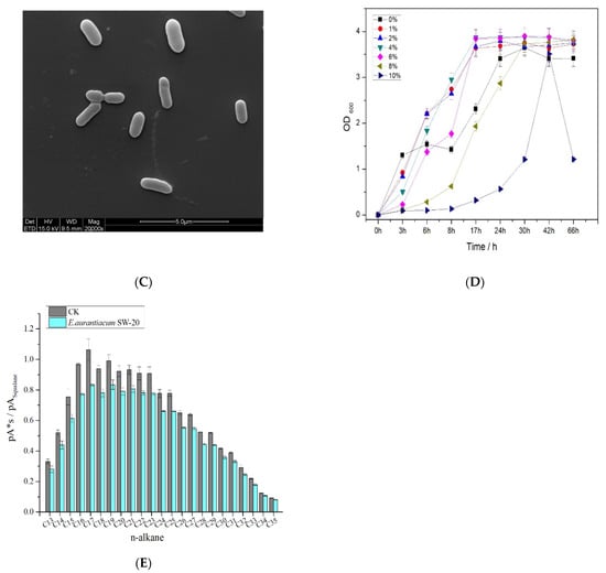 Characteristics of E. aurantiacum SW-20 (A) Colony morphology of the strain in 5% LB solid medium (B) SEM imagines at 0% NaCl (C) SEM imagines at 8% NaCl (D) Growth curve on different content of NaCl (E) Degradation diagram of n-alkanes in crude oil.