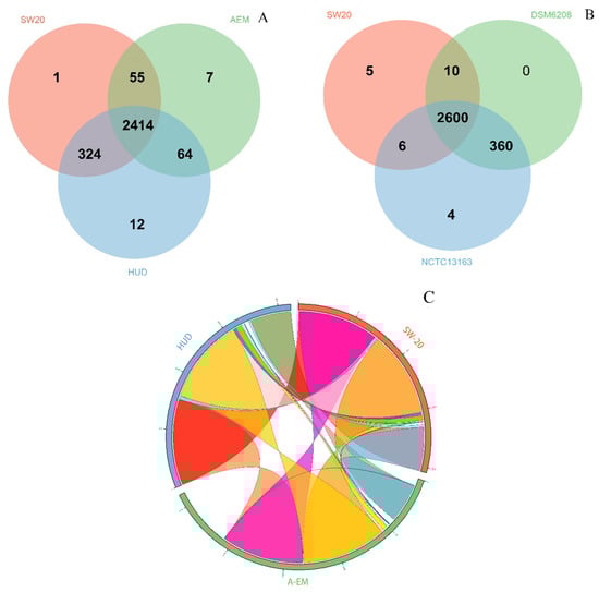 At the level of protein sequence, Veen analysis (Figure 4A) revealed that the three strains including E. aurantiacum SW-20, E. mexicanum A-EM and E. mexicanum HUD form 2877 clusters, 2857 orthologous clusters (at least contains two species) and 20 single-copy gene clusters. There are 2414 ortholog clusters shared by all three species, with 443 clusters shared by at least two genomes. A total of 20 gene clusters were unique to a single genome, with one belonging to E. aurantiacum SW-20 (Figure 4A). The genomes of E. aurantiacum SW-20 and E. mexicanum A-EM shared only 55 orthologous clusters (Figure 4A). The Venn diagram was used to compare E. aurantiacum SW-20 to E. aurantiacum DSM 6208 and E. aurantiacum NCTC13163. As we can see from Figure 4B, there are 2985 clusters, 2976 orthologous clusters (at least two species) and nine single-copy gene clusters. There are 2600 ortholog clusters shared by all three species, with 376 clusters shared by at least two genomes. A total of nine gene clusters were unique to a single genome, with five belonging to E. aurantiacum SW-20 (Figure 4B). The genomes of E. aurantiacum SW-20 and E. aurantiacum NCTC13163 shared six orthologous clusters exclusively, whereas E. aurantiacum DSM 6208 had no gene clusters, indicating that it had only one genome (Figure 4B).