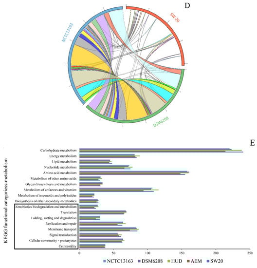 As E. mexicanum A-EM is a genome of phylogenetically closest type strain with available genome sequence and some genome including E. mexicanum HUD, E. aurantiacum DSM 6208 and E. aurantiacum NCTC13163 are also well-characterized. So retrieved all the genomes sequences and download from NCBI database and their comparative genome features with E. aurantiacum SW-20 are all listed in Table 1. The comparison and annotation of orthologous gene clusters were carried out by using OrthoVenn2 (https://orthovenn2.bioinfotoolkits.net/home, accessed on 22 June 2021) []. Sibelia software [] was used and alignment of syntenic blocks were visualized in CGview [] for genome synteny analyses. Predictions of KEGG pathways were carried out in GhostZ using the KEGG automatic annotation server (KAAS) [] and the bi-directional best hit method.