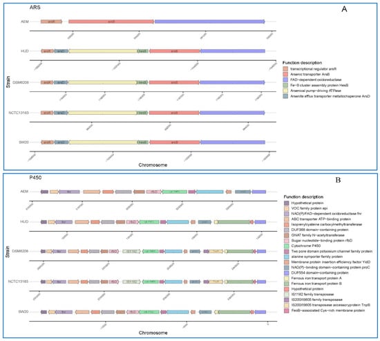 Schematic comparison of the three main gene clusters for different function based on annotations in the KEEG database: (A) Arsenic tolerance (B) Cytochrome P450 hydroxylase and (C) Na+/H+ antiporter protein in E. aurantiacum SW-20, E. aurantiacum DSM 6208, E. aurantiacum NCTC13163, E. mexicanum A-EM and E. mexicanum HUD.