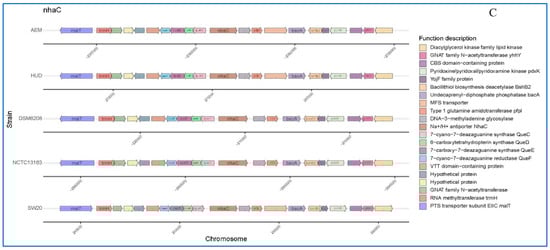 Additionally, we can see that all of the genomes contained an arsenic resistance operon and a Na+/H+ antiporter protein gene (nhaC) cluster (Figure 5A,C), suggesting that this genus has the potential to be arsenic tolerant and salt resistant. The other four strains, with the exception of E. mexicanum A-EM, had identical genetic makeup including six genes (Figure 5A): transcriptional regulator arsR, arsenite efflux transporter metallochaperone arsD, arsenical pump-driving ATPase, Fe-S cluster assembly protein hesB, arsenic transporter arsB, and FAD-dependent oxidoreductase, which showed good application prospects in the field of pollution prevention and remediation of heavy metal arsenic.