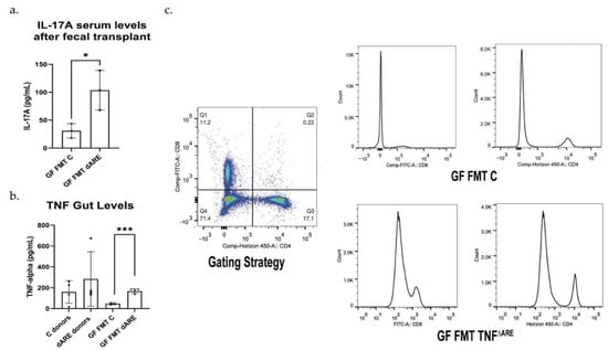 Proinflammatory cytokines measurement and inflammation evaluation by flow cytometry. GraphPad Prism was used to generate the bar plots, that shows the mean of data and error bars show standard deviation. Stars represent significance (* for p < 0.05 and *** for p < 0.001). Multiplex ELISA Assay (Luminex). (a) Multiplex assay was conducted on the serum, with antibodies against TNF, IL-1β, IL-6 and IL-17. Results show a serological statistically significant (p = 0.0290) increase in IL-17A level in serum of GF mice FMT with TNFΔARE+/− donors (n = 6) compared to their controls, GF mice FMT with C donors (n = 3). No significant difference was detected in serum TNF, IL-1 β and IL-6 levels. Results were similar between males and females and were representative of the colony. (b) The multiplex assay was conducted at the tissue level after gut protein extraction. TNF levels were significatively elevated in TNFΔARE+/−donors (n = 4) compared to control donors (n = 4). TNF levels were below the limit f detection in healthy control mice donors. The levels of TNF were significatively elevated in GF mice FMT with TNFΔARE+/− (n = 4) compared to GF mice FMT with C (n = 3, p = 0.0004). (c)—Flow cytometry was conducted on spleen cells using antibodies directed against CD4 and CD8. After gating on lymphocytes, results show an activation and expansion of CD4+ and CD8+ T cells in GF mice FMT with TNFΔARE+/− when compared to their counterpart controls, suggesting an immune response initiation and inflammatory status initiation. Data shown from n = 4 in each group.