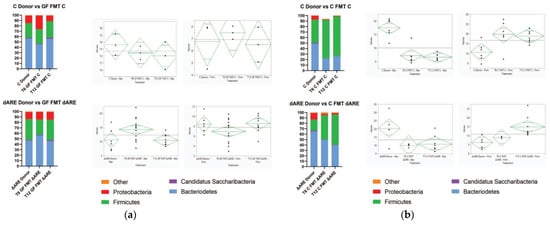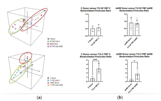 A three-dimensional (3D) representation of the taxonomic data, at both a phyla and genus level, confirms transmission of the TNFΔARE+/− donor microbial profile to GF mice but not to C mice. Clustering is seen between GF mice and their respective donors, but C mice FMT with either C or TNFΔARE+/− donors have distinct localization in 3D space (Figure 5, panel (a), Figure 6, panel (a)). A healthy microbiome is characterized by a stable ratio between the two major phyla present in the gut, Bacteroidetes and Firmicutes [32]. A ratio of Bacteroidetes to Firmicutes conveys a big-picture view of the gut health. Although GF mice exhibited ratios similar to their respective donors, C mice FMT exhibited statistically significant different ratios compared to their respective donors (Figure 5, panel (b)).