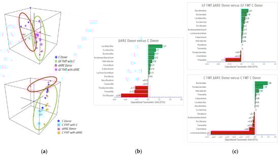 3D visualization of genus communities in FMT colonies and bidirectional bar chart of the 14 genera identified in the disease transmission. Taxonomy panel at the Genus level. Panel (a) 3D representation of clustering at the genus level. Top: GF mice (n = 13) 3D localization is clustered closely to their respective donors (n = 9), similar to what is observed at the phyla level. Bottom: TNFΔARE+/− donors (n = 5) cluster separately from C donors (n = 6) and C mice FMT with either donor (n = 11), similar to the observations at the phyla level. Panel (b) Bidirectional bar chart. BLAST TaxID (OTU) representation of the genera proportion in the donor mice (n = 9). Panel (c) Top: BLAST TaxID (OTU) representation of the genera proportion in GF mice (n = 13). Bottom: BLAST TaxID (OTU) representation of the genera proportion in Control mice (n = 16). These 14 genera were identified as the major key players, exhibiting significant changes in quantity between groups.