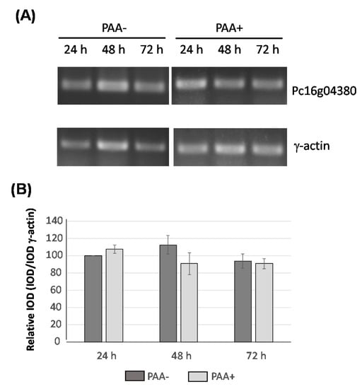 Transcriptional analysis of Pc16g04380 in the presence (PAA+) and absence (PAA-) of phenylacetic acid (PAA). (A) cDNA bands of Pc16g04380 and γ-actin were amplified by RT-PCR from RNA samples taken from cultures grown in complex medium during 24 h, 48 h and 72 h. (B) Integrated Optical Density (IOD) graph shows the expression profiles (normalized to the γ-actin expression levels) at 24 h, 48 h and 72 h. Those values corresponding to the expression of Pc16g04380 at 24 h were set to 100. Densitometry values correspond to the mean plus standard deviation of three independent measurements.