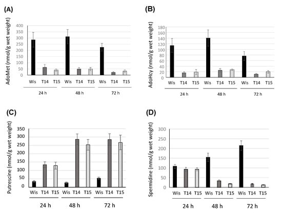 Due to the role of AdoMet in polyamine biosynthesis, the intracellular levels of putrescine and spermidine were analysed by HPLC in knock-down transformants T14 and T15, and the control strain. Figure 4C shows that interestingly, putrescine levels increased in both transformants, which showed a similar behavior, regarding control values. The increase reached maximum values (~10 fold) at 48 h, whereas at 24 h and 72 h, values varied between a ~4-fold and a ~5-fold increase, respectively. On the other hand, spermidine values (Figure 4D) underwent a strong decrease at 48 h and 72 h in the knock-down transformants, with the lowest values (17-fold decrease) being reached by transformant T15 at 72 h.