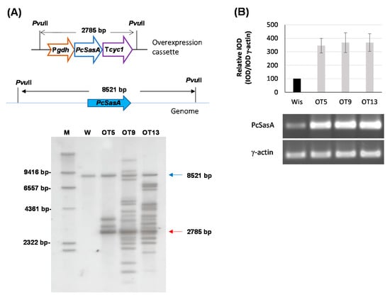 Overexpression of the Pc16g04380 (PcsasA) gene. (A) Southern blot analysis of different transformants and the parental P. chrysogenum Wisconsin 54-1255 strain (W) showing the integration of the 2785-bp overexpression cassette (red arrow). The 8521-bp genomic band containing the genomic Pc16g04380 (PcsasA) gene is indicated with a blue arrow. M (molecular weight marker). (B) Relative expression of Pc16g043801 (PcsasA) in different transformants compared to the Wisconsin 54-1255. cDNA bands of Pc16g04380 (PcsasA) and γ-actin were amplified by RT-PCR from RNA samples taken at 48 h from cultures grown in complex medium. Densitometry (IOD) graph shows the expression profile (normalized to the γ-actin expression levels) of each transformant regarding the values provided by the Wisconsin 54-1255 strain (Wis), which were set to 100. Densitometry values correspond to the mean ± SD of three independent measurements.
