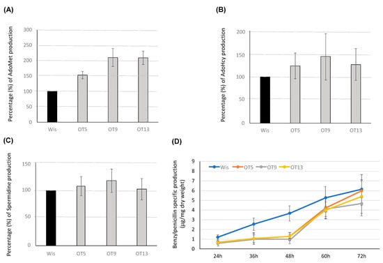 Production of AdoMet, AdoHcy, spermidine and benzylpenicillin in overexpression transformants. Percentage (%) of intracellular levels of (A) AdoMet, (B) AdoHcy and (C) Spermidine in the overexpression transformants OT5, OT9 and OT13 regarding values provided by the Wisconsin 54-1255 strain (Wis), which were set to 100%. (D) Benzylpenicillin specific production (μg/mg dry weight) of the control strain Wisconsin 54-1255 (Wis) and overexpression transformants OT5, OT9 and OT13 grown in defined medium. Results correspond to the mean ± SD from three different experiments carried out in duplicate.