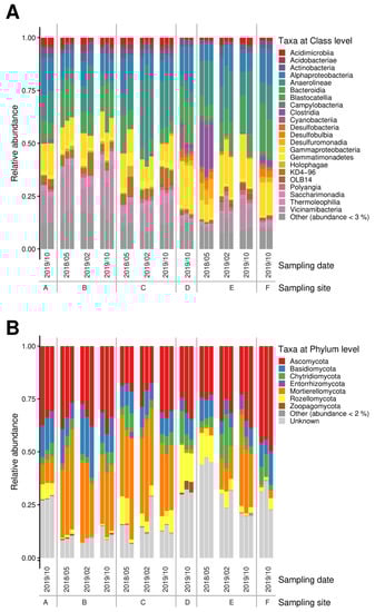 Bacterial (A) and fungal (B) microbiomes along a contamination gradient from sites A to E (compare Supplementary Figure S1).