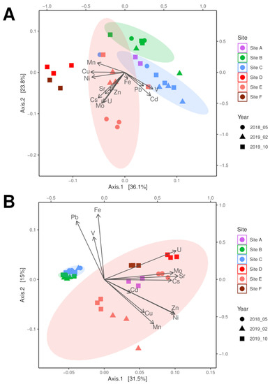 Principal coordinates analysis (PCoA) of the microbiome sequencing data identified that the three soil sampling points were separated by contamination (highest at site E), which became more similar over time with decreasing contamination at site E (Figure 2A). While the community of sampling point C was mainly described by the presence of the metal ions Fe, Pb, Cd, and V, the highly contaminated sampling site E showed a strong separation due to Cs and Sr, but also correlated well with Zn, Cu, Mn, and Ni. With respect to riverbed sediment samples, a similar separation between low contamination at site A and the other sites located downstream of a tailing water inflow (see Figure 2A) more similar to soil data was found. The two riverbed sediment samples of site D and F were well separated by the higher concentrations of Cu, Ni, and Mn, with higher similarity the microbiome of the highest contaminated soil sample of site E.