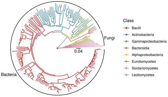 Identification of bacterial isolates was performed by 16 S rDNA sequencing from genomic DNA (Chelex 100, Bio-Rad, Hercules, CA, USA) after PCR amplification (2.5 µL primers 27f: 5′-AGAGTTTGATCCTGGCTCAG-3′ and 1492r: 5′-ACGGCTACCTTGTTACGACTT-3′) [35]. PCR was performed with 2.5 μL dNTPs (Jena Bioscience, Jena, Germany), 0.2 μL DreamTaq and 10 µL Taq-buffer (Thermo Fisher Scientific, Waltham, MA, USA), 30.3 µL sterile nuclease-free water (Carl Roth, Karlsruhe, Germany) and 1 μL template with 5 min denaturation at 95 °C, 30 cycles for amplification (30 s denaturation, 95 °C; 45 s, 60 °C; 90 s, 72 °C), followed by final elongation for 10 min at 72 °C using a Thermocycler T3 (Biometra, Göttingen, Germany). For fungal isolates, DNA extraction [36] was followed by ITS amplification (primers ITS1: 5′-TCCGTAGGTGAACCTGCGG-3’ and ITS4: 5′-TCCTCCGCTTATTGATATGC-3′) [37] with 5 µL primers ITS1/ITS4, 1 µL dNTP’s, 0.25 µL DreamTaq, 5 µL Taq-Puffer 10×, 32.75 µL sterile nuclease-free water, and 1 µL template with 34 cycles following the same protocol. For negative control, nuclease free water was used instead of template. Products were checked by gel electrophoresis using 1% w/v agarose, stained with ethidium bromide, documented (Herolab Image Doc, Herolab, Wiesloch, Germany) and sequenced (GATC, Konstanz, Germany, or Starseq, Mainz, Germany). Sequence assembly was carried out via BioEdit Sequence Alignment Editor. The assembled sequences were checked for chimeras by UCHIME [38]. Taxonomy assignment and phylogenetic tree reconstruction of the resulting sequences was performed with R based on SILVA v138 or UNITE v8.3 [39,40,41].