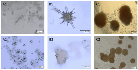 Minerals formed on Cs- (A,B) and Sr- (C) containing media. (A1) Needle-like aggregates and botryoidal crystals formed with Cs2SO4, (A2) tetrahedrons formed with Cs2SO4, (B1) close-up of needle aggregates and (B2) aggregates, formed with CsCl, (C1) brown-colored aggregates, and (C2) singletons formed with SrCl2.