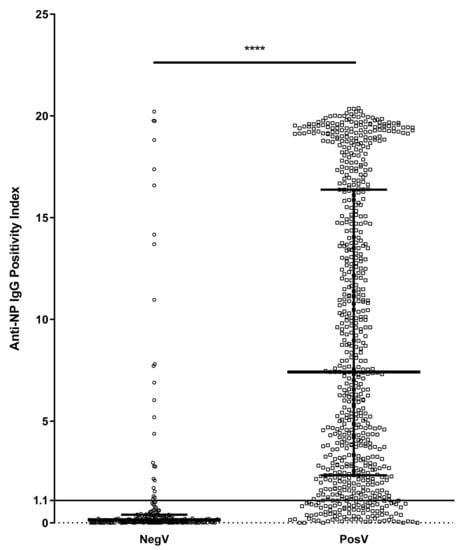 Distribution of positivity index (P.I.) of anti-NP IgG antibodies between negative/untested volunteers (NegV) (n = 194) and SARS-CoV-2-positive volunteers (PosV) (n = 695). The line at P.I. = 1.1 represents the threshold above which samples are considered positive. Bars represent median and interquartile ranges. **** p < 0.0001.