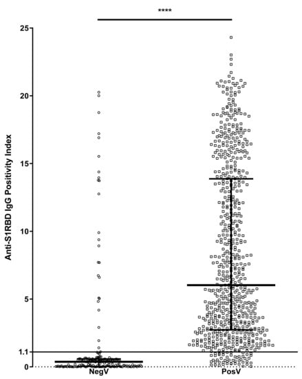 Distribution of positivity index (P.I.) of anti-S1RBD IgG antibodies between negative/untested volunteers (NegV) (n = 194) and SARS-CoV-2-positive volunteers (PosV) (n = 695). The line at P.I. = 1.1 represents the threshold above which samples are considered positive. Bars represent median and interquartile ranges. **** p < 0.0001.