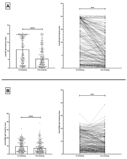 We acquired matched subsequent samples from antibody-positive volunteers, and evaluated the change in anti-NP and anti-S1RBD IgG antibodies. There was a significant drop in the P.I. of anti-NP IgG by 50.140% (p < 0.0001) in the 205 positive volunteers tested between their first and second sample (Figure 3A). Similarly, a significant decrease in the P.I. of anti-S1RBD IgG by 24.070% (p < 0.0001) was observed in that same group (Figure 3B).