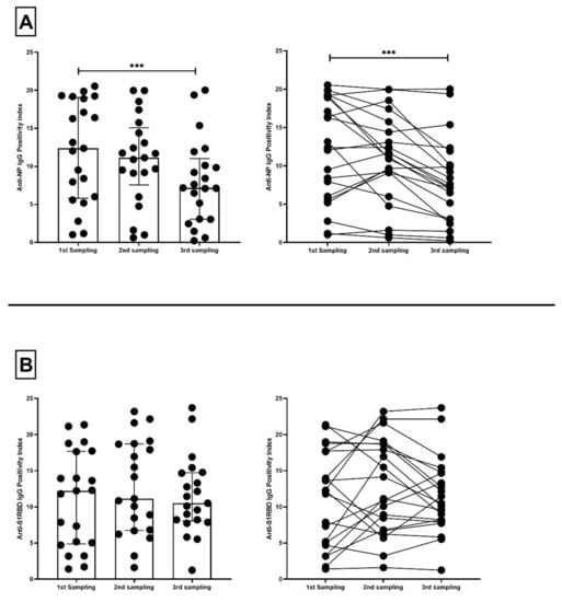 A third sample was obtained from 21 antibody-positive volunteers, and the overall change across the three time points was evaluated. The decrease in P.I. of anti-NP IgG was found significant across the three time points, dropping by 10.090% between the first and second sampling and by 35.680% between the second and third samplings (p < 0.01) (Figure 4A). In contrast, the P.I. decrease of anti-S1RBD IgG was not significant across time, dropping by a total of 13.990% between the first and third samplings (Figure 4B).