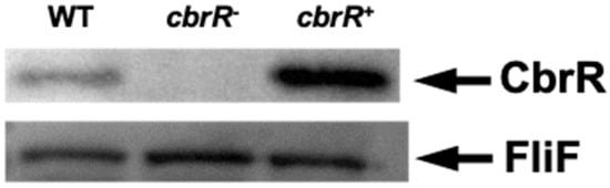 To study the effects of CbrR on C. jejuni phenotypes, we used streptomycin counterselection to construct an unmarked deletion of the cbrR gene [51], as well as a complemented mutant strain. The cbrR− mutant was complemented by inserting the gene with its native promoter via homologous recombination, along with a chloramphenicol resistance (cat) gene for selection, within the intergenic space between the rRNA subunit 16S and the gene for the tRNA-Ala molecule [69]. PCR showed the successful deletion and complementation of the cbrR gene in the mutant and complement strains (Supplementary Figure S3). To confirm the absence and presence of expression in cbrR− and cbrR+, respectively, we performed Western blots on all three strains. Expression of CbrR was missing from the mutant as expected; however, it was unexpectedly found in greater amounts in cbrR+ when compared to the wild-type strain DRH212 (Figure 2). The reason for this unintentional increased expression of CbrR in the complemented strain cbrR+ is not clear but may be related to readthrough transcription from within the rRNA locus, as rRNA synthesis is differentially regulated by growth conditions [70].