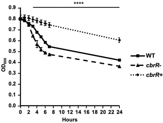 CbrR affects the extent of C. jejuni autoagglutination. AAG assays of WT, cbrR−, and cbrR+ over 24 h. The AAG assay measures the tendency of cells suspended in PBS to aggregate via the flagella over time by measuring the OD600 in the top 1 mL of the 2 mL volume suspension of cells. The cbrR− mutant shows a faster tendency to autoagglutinate when compared to WT, while the complemented cbrR+ shows delayed autoagglutination. All three groups were statistically different from 3 h onward (**** p < 0.0001). A one-way ANOVA with Tukey’s multiple comparisons test was used to determine statistical significance (GraphPad Prism 9, San Diego, CA, USA). This experiment was performed in triplicate and conducted three times.