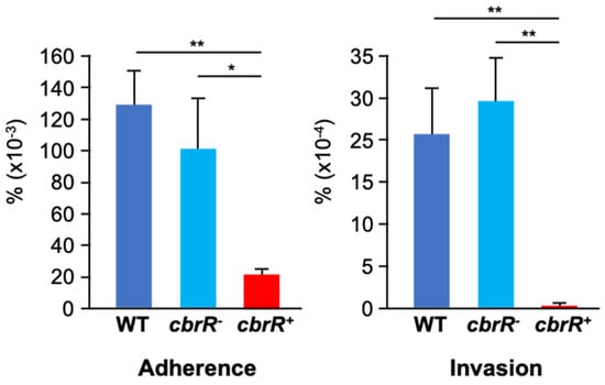 Loss of CbrR expression leads to a defect in host cell adherence and invasion. Assessment of WT, cbr−R, and cbrR+ strains to attach and invade host cells was determined by infecting human epithelial INT407 cells with each of the strains. WT and cbrR− cells attached and invaded cells at similar rates, whereas cbrR+ cells showed deficiencies in both adherence and invasion compared to both WT and cbrR− (* p < 0.05; ** p < 0.01). Statistical significance was determined by a one-way ANOVA with Tukey’s multiple comparisons test (GraphPad Prism 9, San Diego, CA, USA). Experiments were performed three times in triplicate.