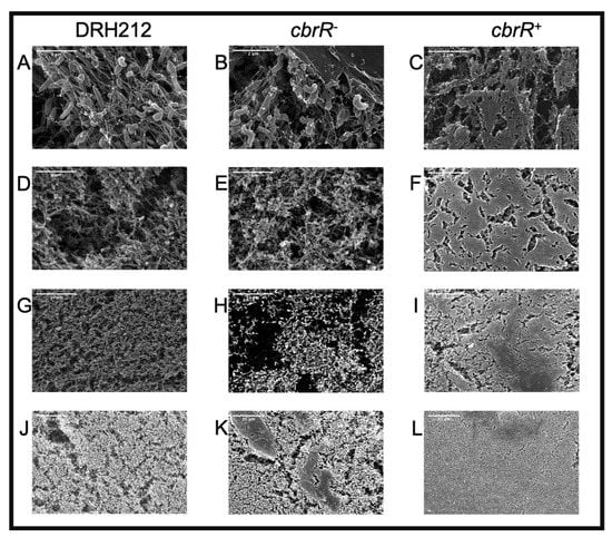 Robust biofilm formation is seen in wild type and cbrR− but is absent in cbrR+. SEM images at different magnifications (25,000×: A–C; 10,000×: D–F; 5000×: G–I; 2000×: J–L) of coverslips propped in C. jejuni inoculated biphasic cultures for 72 h. Images show abundant biofilm formation in DRH212 (A,D,G,J) and cbrR− (B,E,H,K) cells, whereas reduced accumulation of biomass is seen in cbrR+(C,F,I,L).