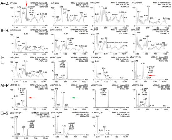 As a putative DGC with variant sequences in both the active site and I-site, we used nucleotide extraction and liquid chromatography with tandem mass spectrometry (LC-MS/MS) to attempt to detect and measure production of c-di-GMP by C. jejuni CbrR. Nucleotide extractions were performed on all three strains of C. jejuni cells that were grown on agar plates, in biphasic cultures, and in broth, as the conditions under which CbrR is activated is unknown. Additionally, the expression vectors used for the DRaCALA assays and controls (the known Vibrio harveyi DGC, QrgB in pCMW75 and an inactive mutant of QrgB in pCMW98) were expressed in BL21(DE3) E. coli cells and nucleotide extractions performed. LC-MS/MS results indicated slight detection in the WT, plate-grown sample that was well below the lowest concentration of purified c-di-GMP used to generate a standard curve, but no detection in any of the other C. jejuni samples (Table 1 and Figure 11A–I). E. coli samples of the control DGC QrgB (pCMW75) indicate a robust, positive result of 816 nM c-di-GMP detected (Table 1 and Figure 11O). Expressed versions of CbrR (pCAF107 and pCAF109) showed detectable amounts of c-di-GMP (Table 1 and Figure 11L,M, respectively, red arrows), whereas the I-site mutant expressed from pCAF110 did not produce c-di-GMP (Table 1 and Figure 11N, green arrow).