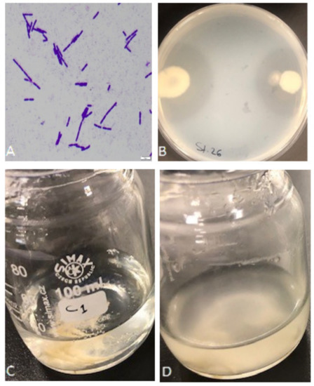 Isolation and screening of keratinolytic bacteria. (A) Bacterial isolates under the light microscope after gram staining. (B) Preliminary screening of isolate S26 for proteolytic activity on skim milk agar showing the formation of a clear zone around the colonies. (C) Growth medium before bacterium inoculation. (D) Feather degradation with bacterial isolate S1 after 72 h of shaking incubation at 37 °C.