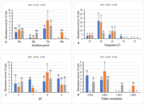 (A) Effect of incubation period, (B) temperature, (C) pH, and (D) feather concentration on white chicken feather degradation by isolates S1, S15, and S26. Bars are the standard error of the mean. Mean with the different letters are significantly different according to Duncan’s at p < 0.05.