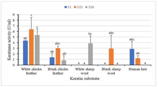 The keratin-biodegradation ability and keratinase activity by S1, S15, and S26 using various keratin substrates (white chicken feather, black chicken feather, white sheep wool, black sheep wool, and human hair) were studied (Figure 3 and Supplementary Materials Figure S2).