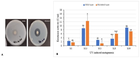 Effect of UV-random mutagenesis on keratinase activity. (A) Wild and UV-mutated isolate S26 showing clear zone of hydrolysis on skim milk agar. (B) Keratinolytic activity of wild isolates and their corresponding mutants. Bars are the standard error of the mean. Mean with the different letters are significantly different according to Duncan’s at p < 0.05.