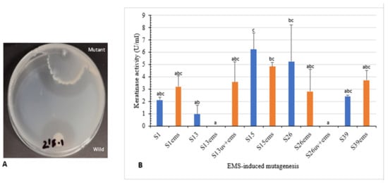 Moreover, isolates S1, S13, S15, S26, and S39, as well as UV mutants (S13uv and S26uv) with higher keratinase activity than the wild type were treated with EMS. Clear zone hydrolysis using skim milk for the wild and mutated isolates is shown in Figure 5A. Keratinase activity was increased with the mutants S1ems (3.2 U/mL) S13uv+ems (3.5 U/mL), and S39ems (3.7 U/mL) compared with the wild isolates after 72 h of incubation (Figure 5B). Results of our study indicated that mutations by EMS increased keratinase activity from 1.5–3.7-fold compared with the wild isolates. The activity of keratinase after mutation by EMS from microbial origin was detected to be 1.4–1.9-fold activity of the wild type [42,43].