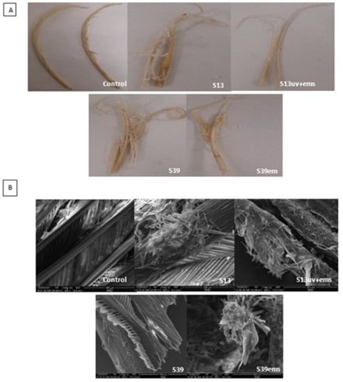Evaluation of biodegradation efficiency of the wild and mutant isolates. (A) Feathers degradation after 72 h of incubation with isolates S13 and S39 and their mutants S13uv+ems and S39ems examined by digital camera and (B) scanning electron microscopy.