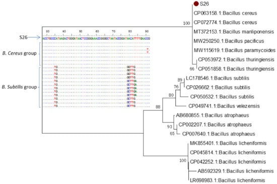 Multiple sequence and neighbor-joining phylogenetic analysis of 16S rRNA gene strain S26 against sequences retrieved from GenBank database.