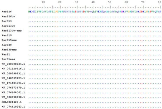 Pairwise alignment comparison between KerS gene (KerS13, KerS13uv+ems, and KerS26uv) and two keratinases retrieved from UniprotKB database showed identity between 97.59–99.10%. KerS26uv shared the highest identity (99.10% and 98.80% with keratinase B. thuringiensis (A0A1L6PVT6) and keratinase ker 6 B. cereus (F8SVT0), respectively).