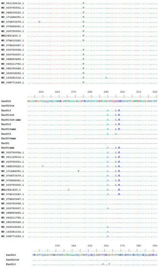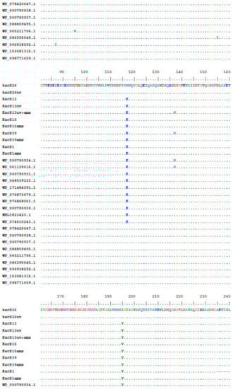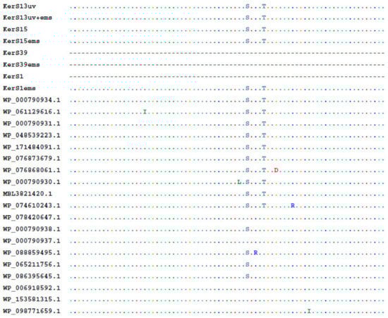 Based on the similarity between our keratinase KerS gene sequences (98–100%), KerS13, KerS13uv+ems and KerS26uv were selected as representative sequences for further analysis. KerS gene is composed of 704–1194 nt and 234–397 aa. Using BLASTp, amino acid sequence analysis of KerS gene revealed a high level of identity (97.98–100%) with S8 family peptidase of B. cereus group (Supplementary Materials Table S1). S8 family peptidase is a subtilisin-like serine protease with a catalytic triad of Asp/His/Ser [47]. Gurunathan et al. [48] in silico identified keratin degrading subtilisin like serine alkaline protease from B. cereus. Fellahi et al. [10] found that the results of amino acid sequences alignment with known B. pumilus proteases indicated that the two keratinases Ker1 and Ker2 of B. pumilus strain C4 are subtilisin-like serine proteases belonging to the protease S8 family.