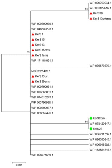 Moreover, seven substitutions (N117K, V195I, A290G, S295L, R297K, T364S, and S368T) observed in the study distinguished KerS26 and its mutant KerS26uv from other keratinase sequences and serine proteases, S8 family peptidase (Figure 8). The seven substitutions were also detected in the serine proteases WP_000790937.1, WP_088859495.1, WP_065211756.1, WP_086395645.1, WP_006918592.1, WP_153581315.1, and WP_098771659.1 (Figure 8). Accordingly, keratinase KerS gene sequences were separated into two groups (Figure 9). The diversity between our keratinase sequences was 0.025, however, it was 0.003–0.022 between our keratinase and those of the serine protease, S8 family peptidase B. cereus group (Supplementary Materials Figure S4). Although the mutant S26uv had 1.73-fold more keratinase activity than the wild S26 strain, no substitutions were detected in keratinase KerS26uv compared to KerS26.