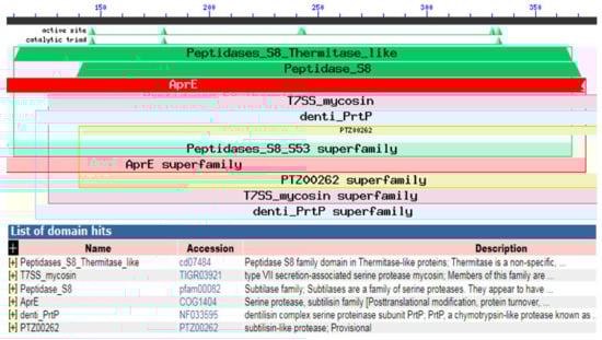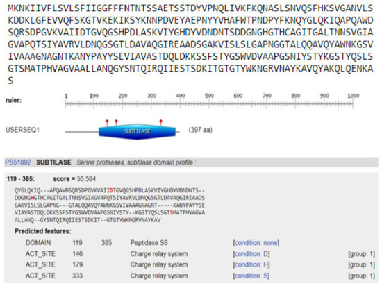 In order to identify protein domains, families, and functional sites, the ScanProsite search tool was used to scan KerS gene for matches against PROSITE profiles and patterns. Functional prediction of keratinase gene resulted in the detection of serine protease subtilase domain (peptidase S8) at amino acid position 119–385 of KerS gene, including the catalytic triad subtilase ASP146, subtilase HIS179, and subtilase SER333 (Figure 10). Most of the keratinases are found in the subfamily S8A including 14 keratinases; their active site contains the catalytic triad of Asp, His, and Ser [33]. The catalytic triad plays an essential role in the catalytic mechanism. The triad is positioned in the active site of the enzyme where catalysis takes place and is conserved in all superfamilies of serine protease enzymes [52]. Interestingly, the detected substitutions in KerS gene (Figure 8) did not affect the prediction of the subtilase domain and the catalytic triad, and accordingly, we suggest that these substitutions did not affect the KerS function. According to the close relationship between KerS and peptidase S8 B. cereus group and the prediction of serine protease subtilase family domain and catalytic tried, we suggest that the KerS gene belongs to serine protease S8 family peptidase. Keratinases belong to the serine- and metalloprotease families. The major keratinase family is the S8 family, and the subtilisin subfamily members, in particular, have keratinolytic activity [7].