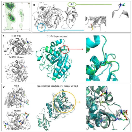 Ramachandran plot was conducted to validate the stereochemical stability of keratinase structure and to explain the structure of the keratinase of the wild and mutant strains. Figure 12A showed 91.98% of the amino acid residue in the most favored region, and 1.43% of the remaining residues in the outlier region, which indicates the model is of good quality and stability for in silico studies. The quality factor of the predicted model was observed as 83.09 using ERRAT2. Gupta et al. [63] validated the modeled structure of the B. subtilis RSE163 keratinase gene using Ramachandran’s plot and results showed that 305 of the amino acid residues (84.3%) were in the favored region. Compared with the previous study by Gupta et al. [63], the current model is relatively better as 91.98% of the amino acid residue is in the most favored region.
