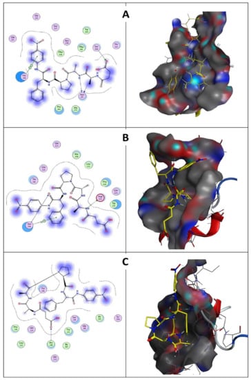 Molecular docking results indicate that no mutations occurred in the active sites (GLN39 LEU65 SER66 LYS67 SER79 ASN102 TYR104 ASP165 TYR166 VAL167 ASP168 ASN169 ASP170 VAL211 ASP213 ASN214 SER217 GLY218 THR219 ASP221 ALA222 GLN225) of the predicted wild keratinase compared with the mutants (Figure 12B). The RMSD values and the superimposed structures (Figure 12C,D) indicate that the mutant proteins D137N (0.003 Å) and the seven mutants (0.006 Å) are structurally slightly different from the wild keratinase. However, the mutant of KerS13uv+ems (D137N) is not structurally much different from the seven mutants of KerS26uv as the substitutions did not affect the functional domains of the keratinase active site (Figure 12C,D). Data presented in Table 3 showed a slight increase in the binding affinity of the mutant proteins D137N of KerS13uv+ems and the seven mutants of the KerS26uv as they exhibited an affinity score of (−7.17, −7.43), respectively, compared with the wild protein (−6.57). Moreover, the E score2 values of the mutant proteins indicate that they are a minor increase in the binding compared with the wild proteins. Furthermore, Figure 13 showed the interaction between the keratinase protein and the ligand, the position of the residues (Ser 300, Asn 271) of wild keratinase, (Asp 132, Ser 194) of D137N, and (Ala 190) of seven mutants that showed the hydrogen bond with the substrate. The docking results of Bacillus sp. showed involvement of Asp160 and Try246 amino acid residues in the binding with all compounds and involvement of the other important residues such as His85, Asp97, Glu131, Asp160, Glu132, Tyr246, and His247 in hydrogen bonding with the substrates [64]. Moreover, the docking results of mutated Stenotrophomonas maltophilia KerSMD revealed that positions of Y94, Y187, and Y215 had direct interaction with the propeptide since it is possible that appropriate binding pockets can enhance the maturation and folding rate of keratinase [49].