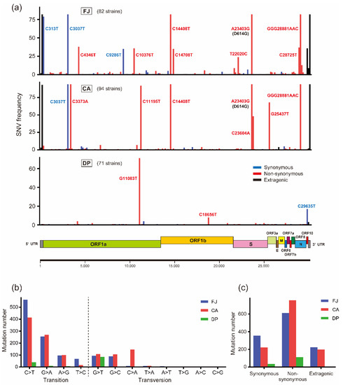 Single nucleotide variants of SARS-CoV-2 strains on cruise ship clusters. (a) The genome position of nucleotide variations found among the FJ Japan, Costa Atlantica, and Diamond Princess strains compared with the Wuhan-Hu-1 strain (GISAID accession no. EPI_ISL_402125). Nucleotide positions are indicated for the main variants. Synonymous, non-synonymous, and extragenic variants are depicted in blue, red, and black, respectively. The genome of SARS-CoV-2 is displayed under the SNV frequency graph. SNV, single nucleotide variant; FJ, FJ Japan; CA, Costa Atlantica; DP, Diamond Princess. (b) The number of detected nucleotide transitions and transversions in FJ, CA, and DP strains relative to the Wuhan-Hu-1 strain. (c) The number of detected synonymous, non-synonymous, and extragenic mutations on the genome sequence of SARS-CoV-2 relative to the Wuhan-Hu-1 strain.