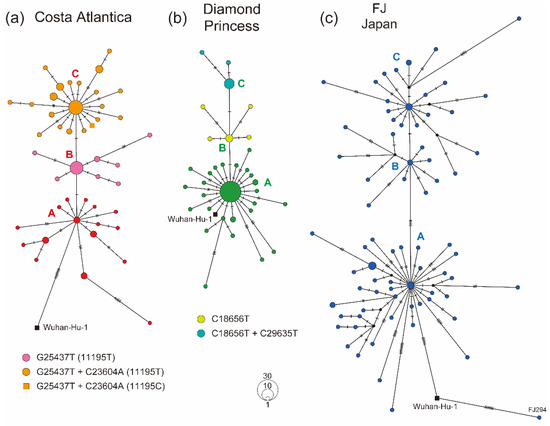 Haplotype network using whole-genome sequences of the cruise ship cluster strains. (a) Haplotype of the Costa Atlantica strains inferred using a median-joining single nucleotide variant network analysis. The presumed first spread cluster (cluster A) is indicated in red, and G25437T and G25437T+C23604A variants (clusters B and C) are in magenta and orange, respectively. (b) Haplotype of the Diamond Princess strains. The presumed first spread cluster (cluster A) is indicated in green, and C18656T and C18656T+C29635T variants (clusters B and C) are in light green and light blue, respectively. (c) Haplotype of the FJ Japan strains. Small tick marks on branches depict the number of single nucleotide variants between haplotypes.