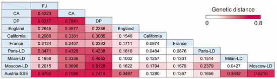 SARS-CoV-2 transmission on a cruise ship may recapitulate the COVID-19 situation in lockdown cities or large-scale superspreading events owing to their similarities in environment and isolated or crowded places. To analyze the genetic distance between cruise ship clusters and other situations of COVID-19, pairwise distance (Fst) was calculated using SARS-CoV-2 genome sequences detected in lockdown cities (Paris-LD, Milan-LD, and Moscow-LD), a superspreading event in Austria (Austria-SSE), and countries/cities without lockdown (England, France, and California) [,]. All Fst values were statistically significant (p < 0.001). The results showed remarkable genetic closeness (Fst < 0.1) between lockdown cities (Milan-LD and Moscow-LD) or within the same country (France and Paris-LD), as well as cities without lockdown (California and France), indicating that the analysis using a population genetics method was a reasonable approach for examining evolution of SARS-CoV-2 populations (Figure 4). Cruise ship populations (CA and DP) were significantly differentiated from SARS-CoV-2 circulating in lockdown cities or superspreading events (Fst > 0.2). Interestingly, the population of the CA cruise strains showed a large genetic distance from that of the DP cruise cluster (Fst > 0.7) (Figure 4). Moreover, the Austria-SSE population showed a significant genetic distance from cruise ship populations (Fst > 0.7), although the haplotype network of DP strains showed similar characteristics as those of the Austria-SSE population in segregating and parsimony-informative sites (Table S3). These results suggest the unique evolution process of the population of cruise ship strains. The SARS-CoV-2 populations of countries/cities with or without lockdown showed a relatively close genetic relationships (Fst < 0.2) except the value between Paris-LD and Moscow-LD, indicating that the environment for the virus spread was similar in such large-scale populations (i.e., countries/cities), and that the cruise ship clusters and a superspreading event (Austria-SSE) were in a unique condition considerably distinct from large-scale populations. FJ strains, detected in Japan without lockdown, showed relatively larger Fst values against the foreign populations without lockdown (Fst: 0.212–0.297) than those between cities without lockdown except Japan (Fst: 0.097–0.171), possibly reflecting the fact that the environmental condition of the Japanese island is dissimilar to other reference regions and promoted the development of Japan-specific haplotypes (Figure 4).