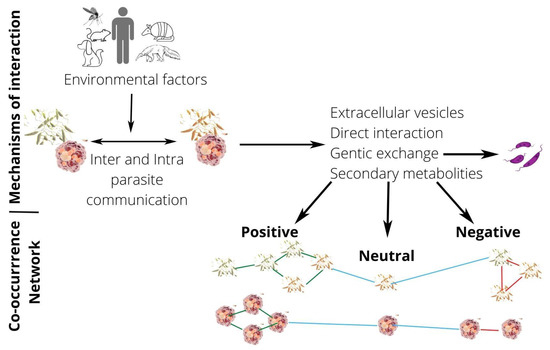 Picture of Leishmania interactions through co-occurrence networks. Leishmania interactions are influenced by hosts’ factors (environmental factors) and can result in positive, neutral, and negative interactions types. In co-occurrence networks, nodes are represented by promastigotes (in invertebrate hosts) or amastigotes (in vertebrate hosts) of Leishmania spp., and edges are representing associations between parasites (nodes). Blue edges indicate neutral interactions, green edges indicate positive interactions, while red edges suggest negative interactions between Leishmania species, strains or genotypes.