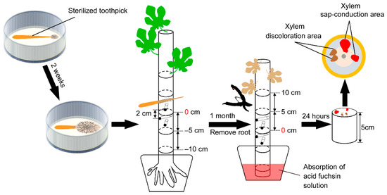 To evaluate the water function in the main stems of the saplings, a dye injection was performed (Figure 1). Immediately after severing the main stem base, the ends of the cut stems were placed in 1% (w/v) aqueous acid fuchsin for 24 h in a greenhouse. Subsequently, the immersed stems were cut into 5 cm long segments (Figure 1). On the cut surfaces, the xylem sap-conduction area (pink area; functional xylem) dyed with acid fuchsin, xylem discoloration area (brown area; non-functional xylem) infested with fungal inocula, and the entire cross-sectional area (excluding the pith) were observed (Figures S3 and S4). RGB images were acquired using a Sony ILCE-6000 digital camera (Sony Corporation, Tokyo, Japan), and ImageJ software (Win64, version 1.52p, National Institutes of Health, Bethesda, MD, USA) was used to quantify the images.