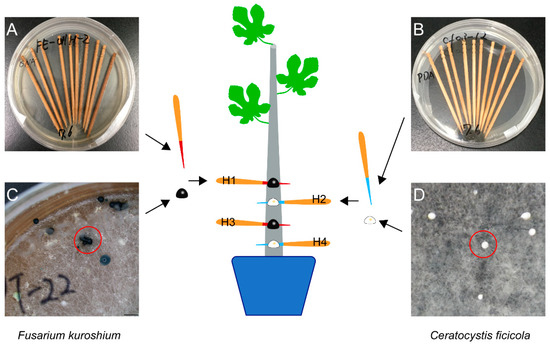 The dual inoculation of both Fusarium kuroshium (H1 and H3) and Ceratocystis ficicola (H2 and H4) on the fig saplings. (A) Toothpicks with hyphae of F. kuroshium; (B) toothpicks with hyphae of C. ficicola; (C) F. kuroshium with the greenish conidial masses (red circle); (D) C. ficicola with buff-yellow ascospore masses (red circle).