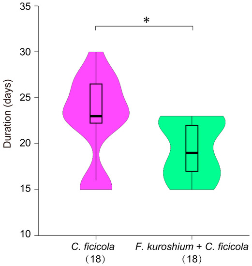 The ambrosia beetle Euwallacea interjectus (Blandford) attacked poplar trees (Populus deltoides Bartram ex Marshall cv. ‘Deltoides’) in Argentina [12] and (Populus × canadensis Moench) in China [13] as well as box elder (Acer negundo L.) in the USA [14]. It is an important vector in FWD in Japan [4,6,15,16]. According to previous studies, E. interjectus may be a secondary pest of FWD because it does not contain C. ficicola within its mycangia (a special organ for storing and transporting fungal symbionts) [17,18]. Nonetheless, of the 22 species of ophiostomatoid fungi isolated from adult females of wild and reared E. interjectus, at least two dominant fungi, Fusarium kuroshium (Na, Carrillo et Eskalen ex Sand.-Den. et Crous) [18] and Neocosmospora metavorans (Al-Hatmi et al.) [19], respectively, may affect the progression of FWD. Morita et al. [7] reported that inoculation with C. ficicola killed the ‘Horaishi’ fig saplings. However, the degree of fungal symbionts of E. interjectus involved in FWD pathogenesis remains unclear. An understanding of the relationship between C. ficicola and symbionts, all of which are vectored by E. interjectus, may be useful for developing suitable disease control strategies.